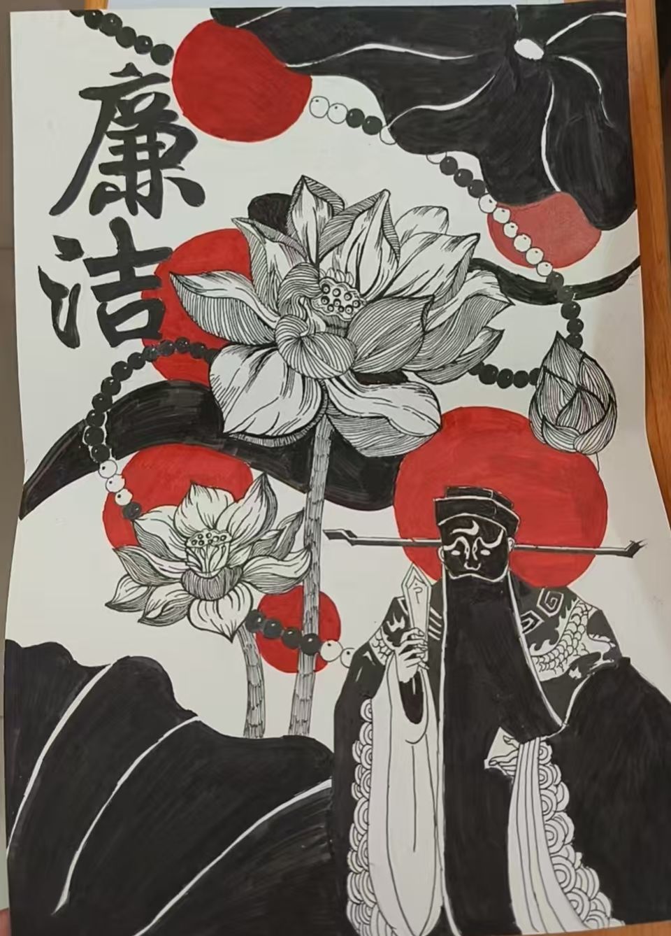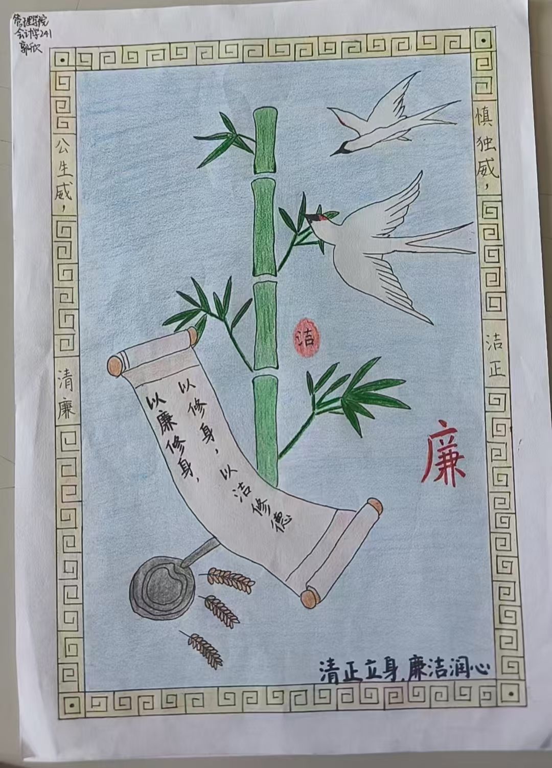 “绘廉铸魂”创意征集活动同样反响热烈。参与者从校园景观、校史典故中汲取灵感,通过创意书画等艺术形式,将廉洁理念可视化,深化了对廉洁文化的理解与认同,进一步推动廉洁意识融入校园日常生活。该活动通过艺术创作激活思政教育形式,拓展了“美育与思政相结合”的实施路径,使学生于笔墨色彩间感受廉政文化的力量,增强了思政课的感染力和覆盖面。