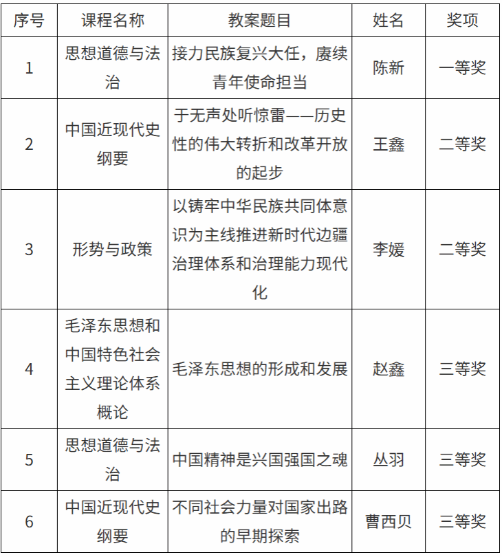 近日,由辽宁省教育厅主办的2025年辽宁省高校思想政治理论课精品教案成果评选活动正式揭晓获奖名单。我校tyc122cc太阳成集团教师精心打磨的精品教案,凭借新颖独到的设计逻辑与扎实深厚的学理支撑脱颖而出,一举斩获六项大奖。其中,陈新荣获一等奖,王鑫、李媛荣获二等奖,赵鑫、丛羽、曹西贝荣获三等奖,为学校教育教学成果再添亮眼实绩。